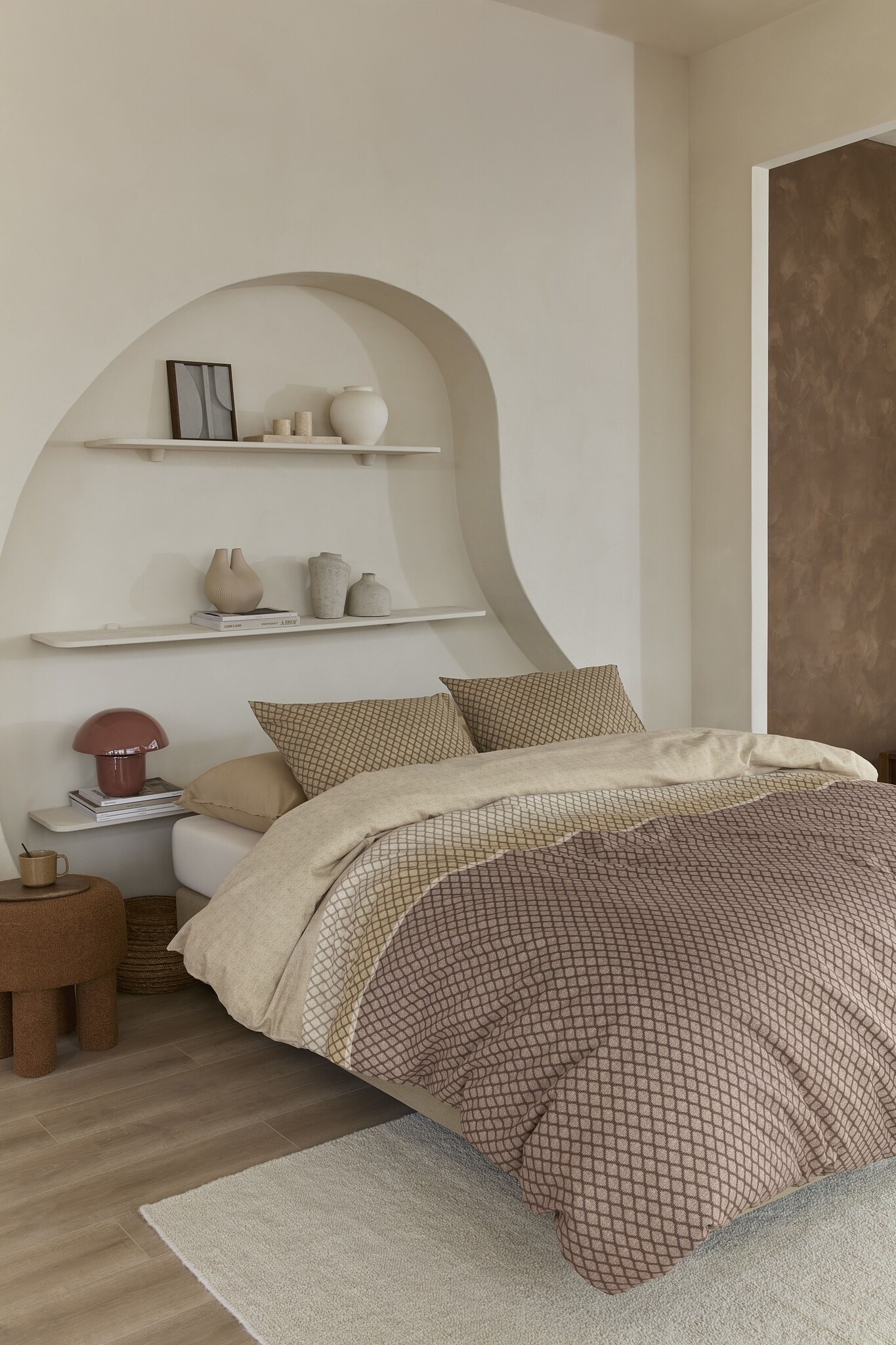 Dit dekbedovertrek combineert natuurlijke materialen met een modern design. Dankzij het gebruik van katoen voelt het zacht aan, ventileert het goed en is het eenvoudig te onderhouden. Het neutrale beige maakt het bijzonder geschikt om te combineren met uiteenlopende woonstijlen: van Scandinavisch minimalisme tot warme, riante interieurs. Het grafische dessin geeft nét dat beetje extra detail zonder overheersend te zijn, waardoor het zowel geschikt is voor een volwassen slaapkamer als een stijlvolle kinderkamer met een rustig palet.