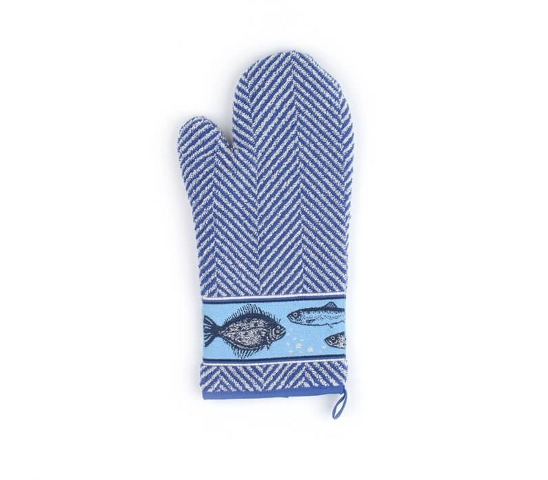 Ovenwant Fish van Bunzlau Castle gebruik je met plezier na het bakken of maken van heerlijke ovengerechten! Deze ovenwant heeft een visgraatdessin in een blauw-witte kleur. Er staat een strook op afgebeeld met diverse vissen op een lichtere blauwe ondergrond. Leuk te combineren met de pannenlappen of de theedoek Fish.