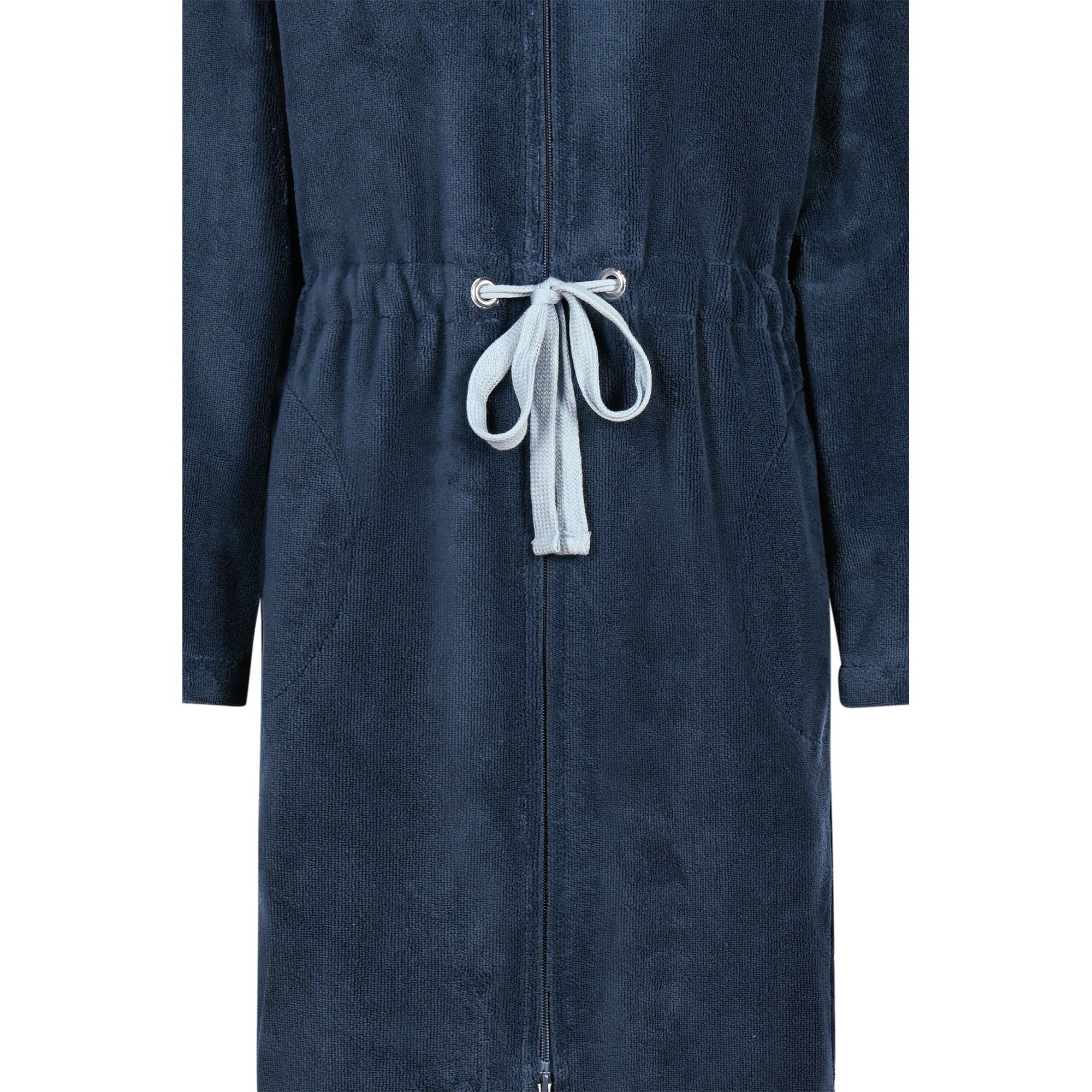 Deze badjas is niet alleen stijlvol, maar ook uiterst praktisch. De ritssluiting zorgt ervoor dat de badjas gemakkelijk aan en uit te trekken is, terwijl de capuchon extra warmte en comfort biedt. Het effen dessin in de kleur blauw geeft de badjas een tijdloze uitstraling, waardoor deze geschikt is voor elke gelegenheid.