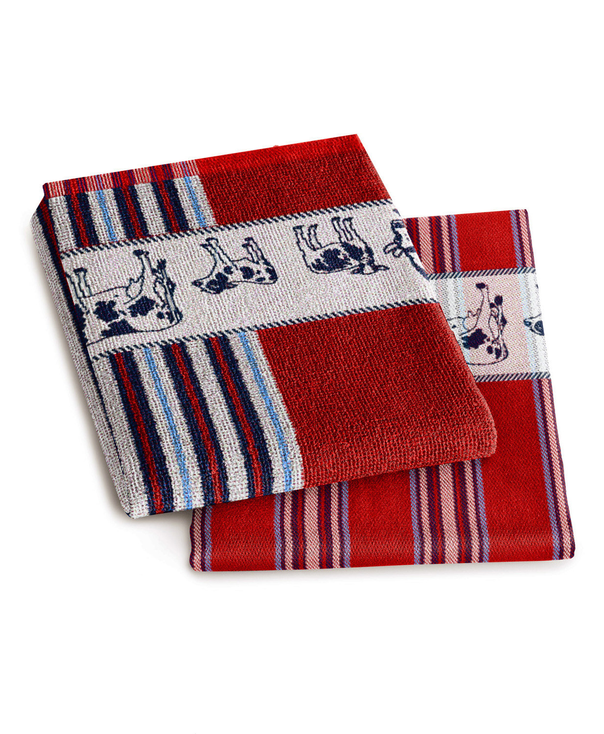 De theedoek 'Friesian red' van DDDDD is een theedoek met een typisch Hollands dessin: koeien! De theedoek heeft een gestreept dessin in blauw/wit/rood en in de border een ingeweven koeien dessin.