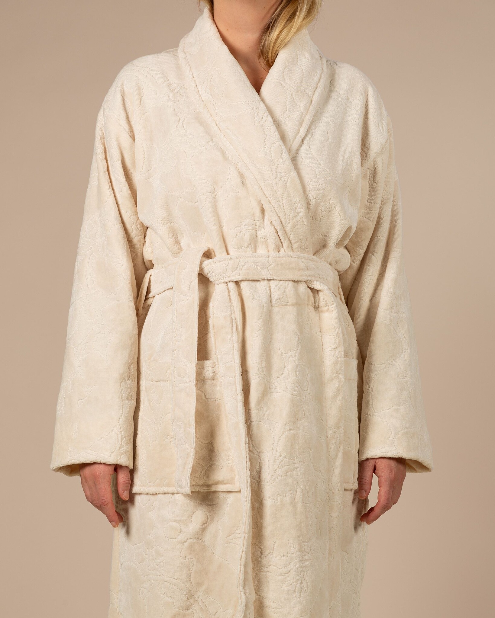 De Essenza Rosie Badjas is niet zomaar een badjas; het is een statement van elegantie en verfijning. Met zijn prachtige bloemen & planten dessin in een subtiele beige kleur, voegt deze badjas een vleugje natuur en rust toe aan je badmode collectie. Of je nu op zoek bent naar een badjas voor dames of gewoon je badtextiel wilt vernieuwen, deze badjas is een uitstekende keuze.