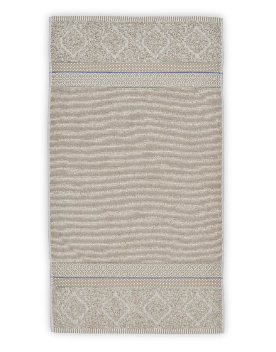 De Soft Zellige Douchehanddoek Khaki heeft een streepjes dessin in khaki en wit. Aan beide zijkanten zitten drie biesjes in de kleuren licht blauw en donker blauw. Daar tussenin zitten drie verschillende, stijlvolle jacquard geweven, bloemenpatronen in de kleuren khaki en wit. De douchehanddoek heeft een khaki-wit gestreepte boordafwerking. Je kan de badgoedserie Soft Zellige perfect combineren met de andere badgoedseries van Pip Studio. Dit geeft een leuk mix and match effect in je badkamer.