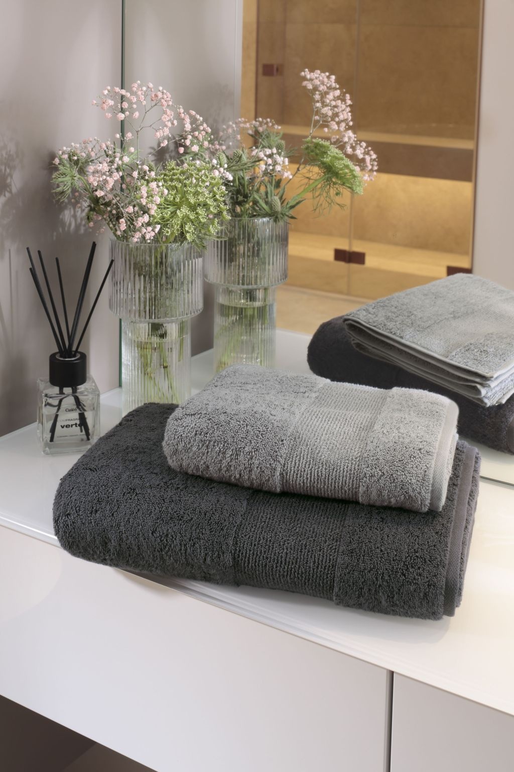 - Neutraal, stijlvol ontwerp: effen grijs dat combineert met spreien, handdoeken en accessoires.